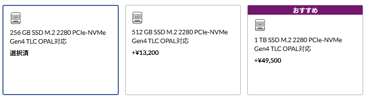 ストレージ256GB / 512GB / 1TB SSD (M.2 PCIe NVMe)
