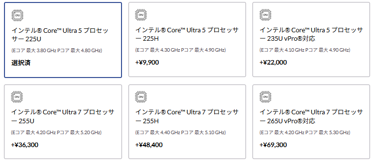 | プロセッサー | Core Ultra 7/5(255H, 225H, 265U, 255U, 235U, 225U) ※vPro対応モデルあり |