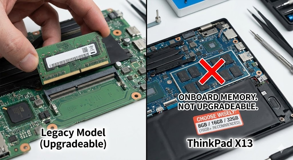 かつてのX200番台(X270等)まではメモリ交換が可能でしたが、X13シリーズは全世代でメモリがオンボード(基盤直付け)です。