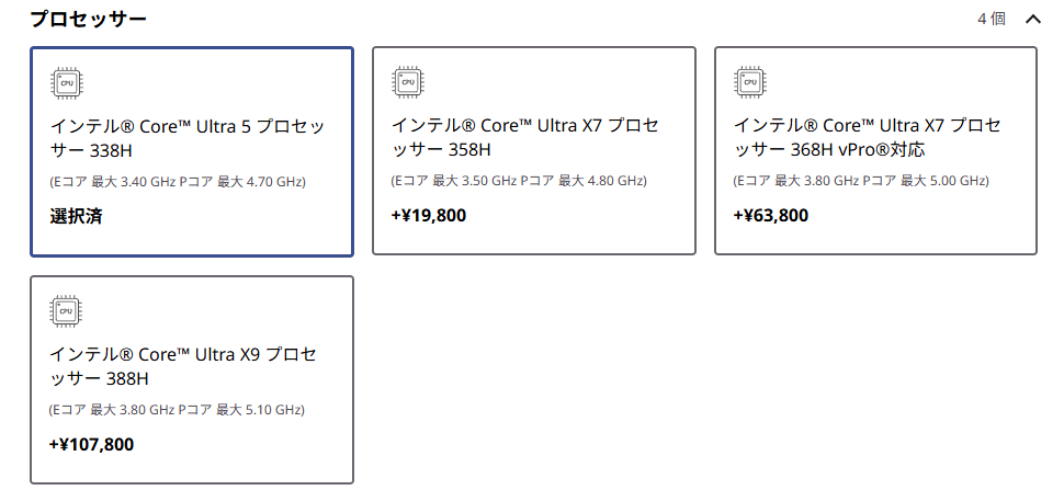 標準の Core Ultra 5 338H でも十分パワフルですが、このマシンのポテンシャルを最大限に引き出すなら、アップグレードを検討しましょう。