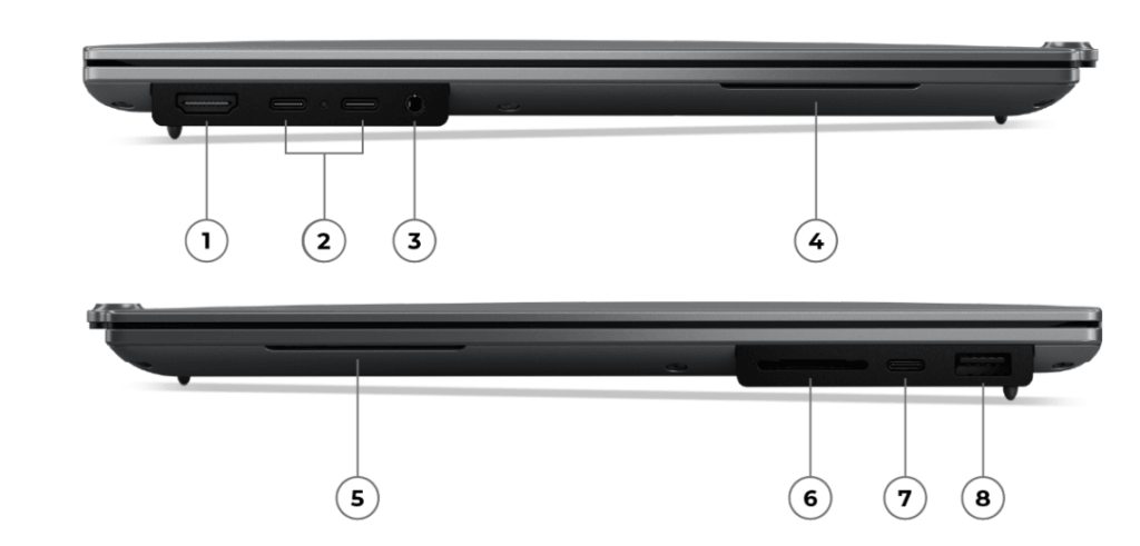 - ⑦Thunderbolt 4 (x1): 右側にも配置することで、電源供給やデバイス接続の自由度が飛躍的に高まっています。
