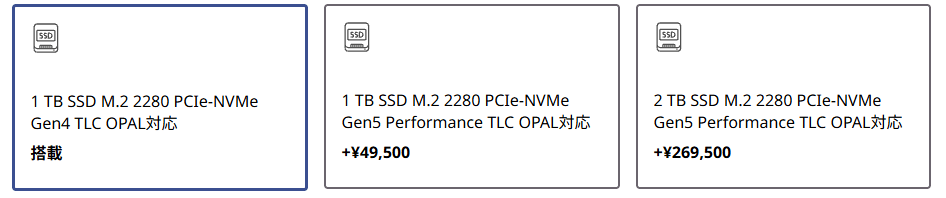 - 2TB PCIe 5.0 (+269,500円): 非常に高額です。幸いなことにストレージはM.2 2280スロットのため、将来的な換装の余地はあります。初期コストを抑えるなら1TBに留めるのも賢い選択です。
