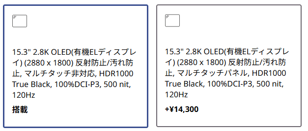 - マルチタッチパネル (+14,300円): 直感的な操作が可能になりますが、わずかに質量が増える傾向にあります。クリエイティブな用途で画面を直接操作したい方には、比較的リーズナブルなオプションです。